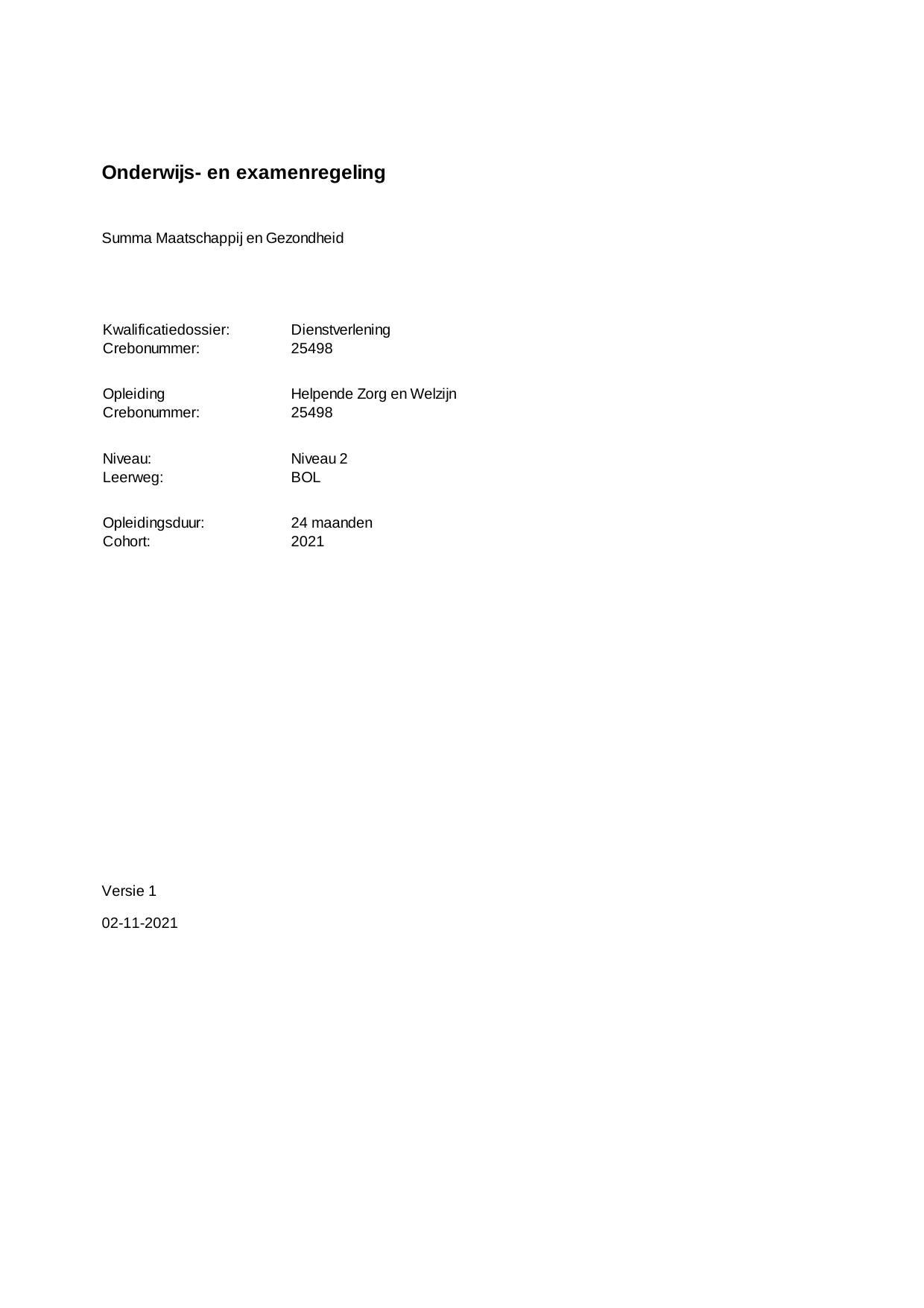 Helpende Zorg en Welzijn 25498BOL24.01 in cohort 2021-2022